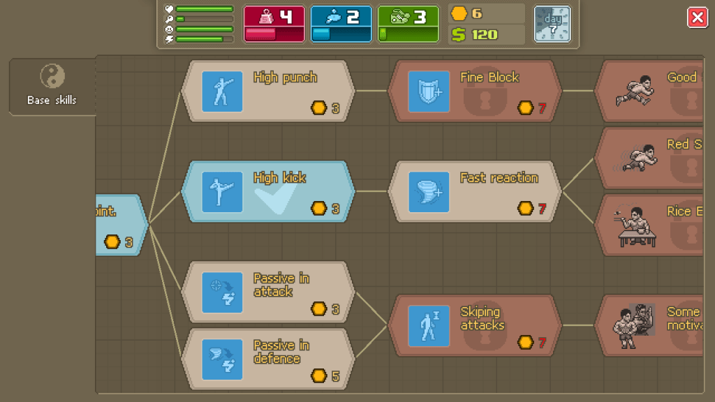 After training I was off to the local pizza place to earn a few bucks delivering pizzas. The manager of the pizza place, Casey, then offered to show me some moves and hit the pads. This was the first introduction to the combat system. Before a fight you have a certain amount of focus points to spend. These points can be spent on moves like uppercut, dodge, block, jab, and kick. It’s up to you to strategically set up a plan of attack with these focus points. New moves can be unlocked from a skill tree, which requires points that are gained from fights. After wailing on some pads it was time to hit the grocery store for some food.