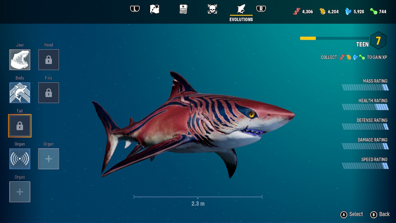 There are two types of missions that are the standouts, the first being the apex predator hunts. Each area in the game is patrolled by a souped-up version of one of the standard predator species you’ll cross paths with, and you’ll need to go toe-to-toe with these creatures in a fight to the death. The other mission type is the infamy rank missions, which are also a necessity to unlocking new areas. The more havoc you wreak, the higher your infamy rank will climb, which will bring all sorts of shark hunters out of the woodwork to take you out. Each infamy rank, up to a maximum of ten, is associated with a unique shark hunter mini boss that will lock onto your position. Taking these shark hunters out, as well as the previously mentioned apex predators, will unlock unique body and organ upgrades that will make your showdown with Scaly Pete that much easier.
